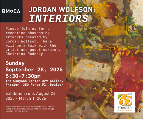 Join us on Sunday, September 28, from 5:30 to 7:30 p.m. for the opening reception of “Interiors,” an exhibition by Jordan Wolfson. There will be a discussion with the artist and the curator, Christian Rudosky, at 7 p.m., free and open to all. In partnership with the Boulder Museum Of Contemporary Art, this exhibit will be displayed in The Canyons Center Art Gallery at Frasier until March 1, 2026.